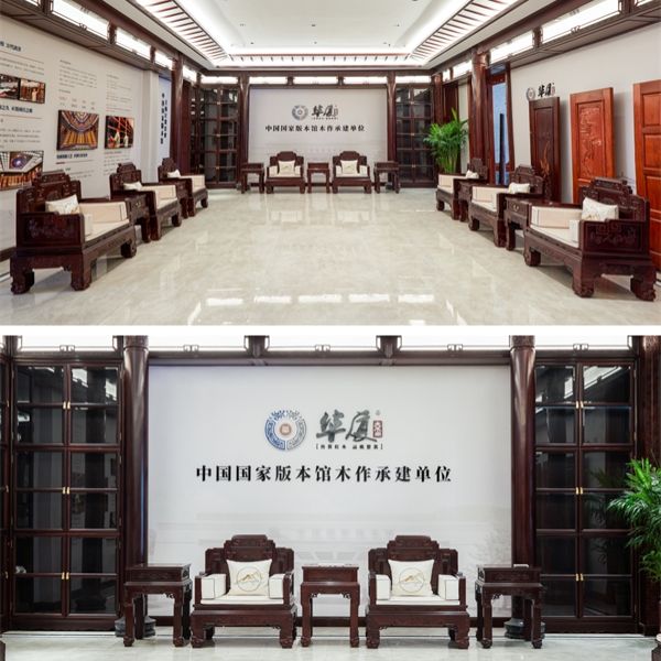 在国家版本馆中央总馆-木作项目中,负责国家书房书柜,及贵宾厅《国宾沙发》、《文兴屏风》、《文兴多宝阁》;文瀚厅1-3层书柜;文瀚阁四层会议室会议桌椅、书柜,及五层贵宾厅《文瀚椅》、《文瀚柱》、书柜;文兴贵宾厅《文兴南官帽椅》、《文兴多宝阁》;洞库架柜等区域的木作项目制作,充分展示了红木文明的灿烂辉煌。