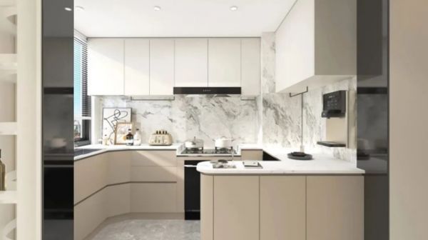 厨房是我家的重要空间之一。设计师们为厨房采用了半开放式设计,既保持了空间的独立性,又增加了与家人的互动性。高低台面的设计符合人体工学,让洗切和烹饪变得更加轻松。暖灰色仿石材纹理大砖作为整体空间的底色,搭配奶白灰的柜体和米驼色的柜门,营造出一种温馨、浪漫的空间气质。U型动线设计让厨房空间更加流畅,转角备餐台的设计增加了储物空间,同时也让空间更加通透。感应式升降插座的设计非常人性化,不仅方便使用,还科技感十足。