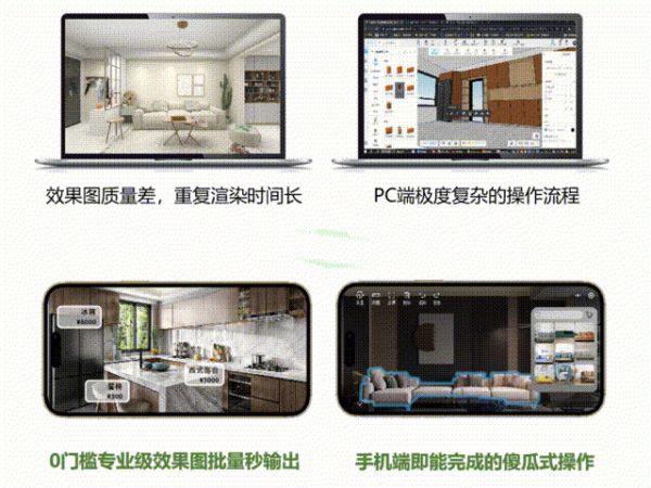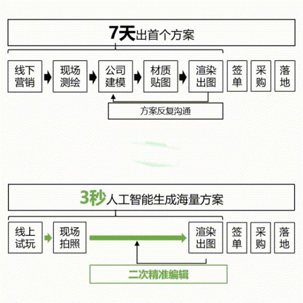极速设计是我们驱动供应链变革的关键。在B端线下门店场景中,用户、销售、前台设计师、后台设计师、家具工厂、施工方之间存在冗长的信息传递链路。每次设计方案的意见传递和反馈长达一周用户的设计需求难以锁定,还容易被竞争门店抢单。前期极高的门店获客成本最终由消费者和厂商共同买单。