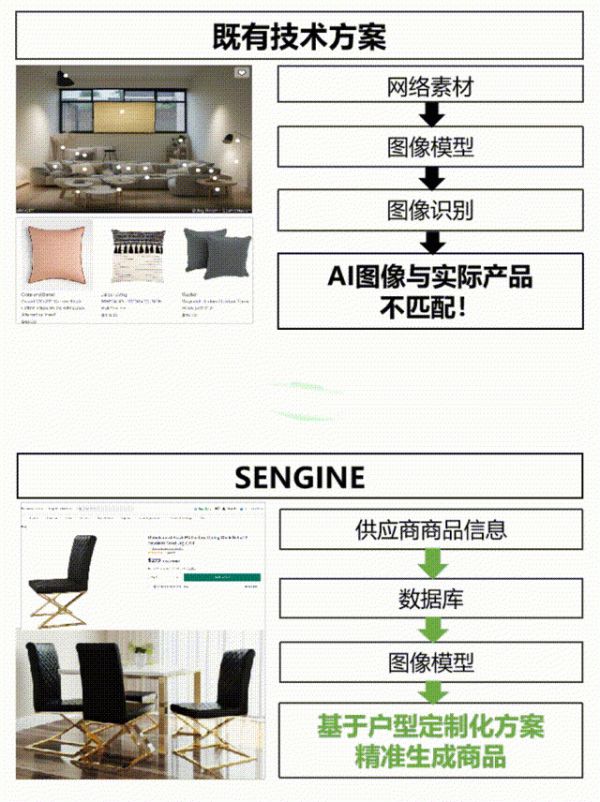 在C端家居电商购物体验中,消费者往往拿捏不准商品实际摆放在家中的效果,只能通过小红书等平台来寻找美学灵感,再去电商平台搜索同款。整个调研、消费链路时间长、门槛高。随着AI图像平台的大量涌现,一部手机+房间实景照+AI,几秒内就能在许多创意平台上生成一张家装效果图。但是,这些设计效果图往往仅仅停留于灵感创意的阶段,效果图与真实商品不匹配。与市面上普遍的先生成再识别的技术方案不同,生境科技使用全正向生成的逻辑,发布了市面上第一家实现家具商品精准生成的APP闪境AI。通过图像推测引擎,AI能智能推理商品在特定房间中位置和透视关系,将商品细节准确还原到指定环境中来,所见即所得。