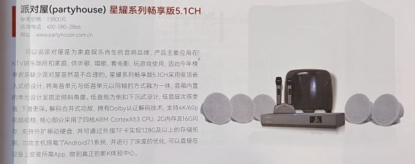 《家庭影院技术》杂志作为中国影音行业的知名媒体,经过综合评比后,派对屋(partyhouse)星耀系列畅享版5.1CH,在此次客厅影院音响系统类别中拔萃而出,被列入家庭影院技术杂志“2023-2024 AV TOP 100优秀器材推荐榜”上榜产品,对Partyhouse派对屋的家庭客厅影K音响的性能和质量表示了充分的认可。