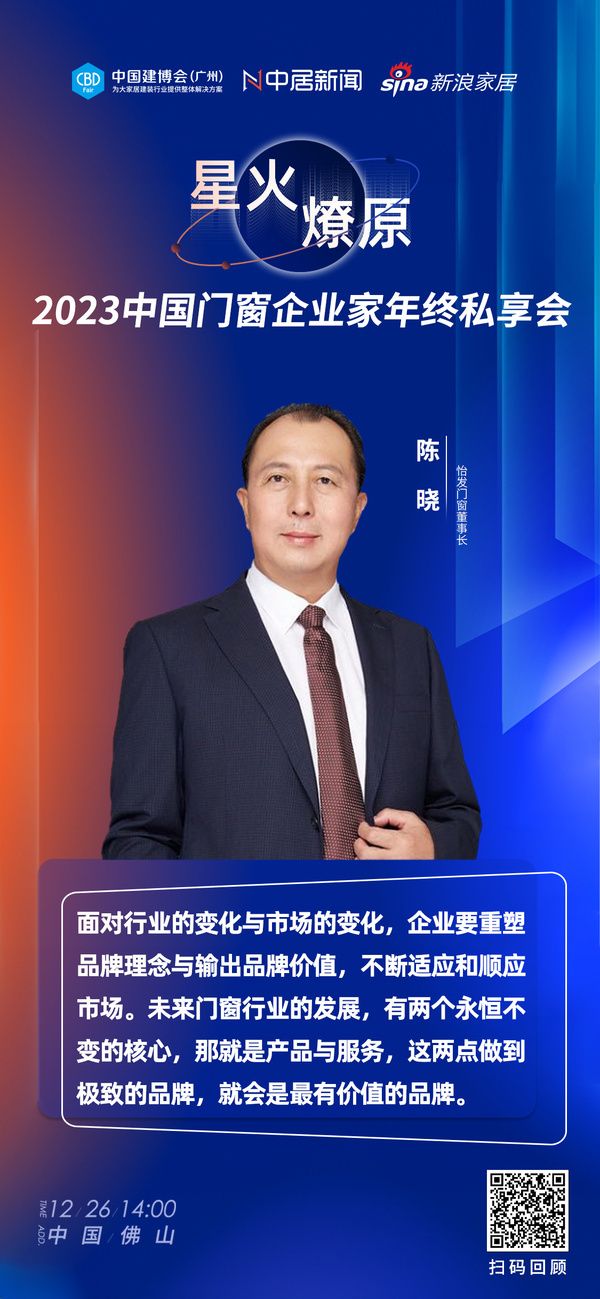 怡发门窗董事长 陈晓:面对行业的变化与市场的变化,企业要重塑品牌理念与输出品牌价值,不断适应和顺应市场。未来门窗行业的发展,有两个永恒不变的核心,那就是产品与服务,这两点做到极致的品牌,就会是最有价值的品牌。