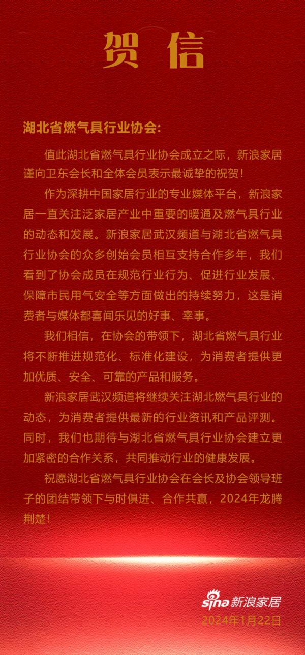 对于湖北省燃气具行业协会的成立,新浪家居也第一时间送上了真诚的祝贺,作为深耕中国家居行业的专业媒体平台,新浪家居一直关注泛家居产业中重要的暖通及燃气具行业的动态和发展。新浪家居武汉频道与湖北省燃气具行业协会的众多创始会员相互支持合作多年,看到了协会成员在规范行业行为、促进行业发展、保障市民用气安全等方面做出的持续努力,这是消费者与媒体都喜闻乐见的好事、幸事。