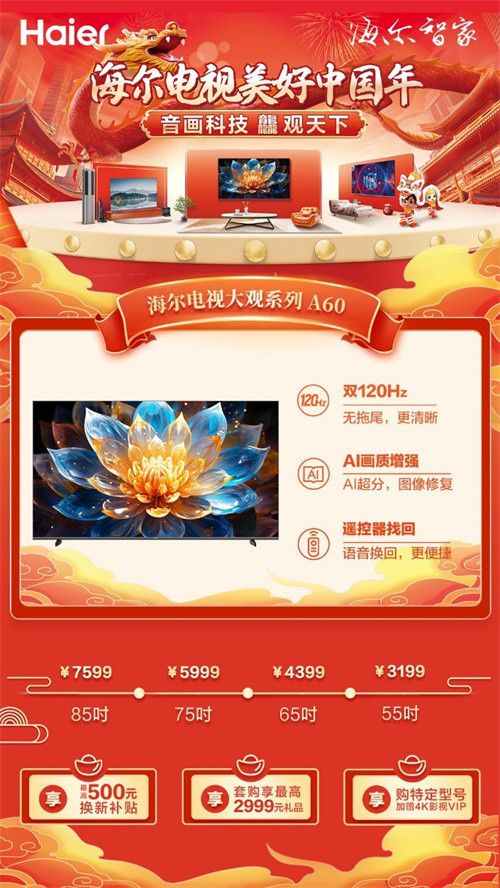 春节选年货,就选海尔!海尔电视大观系列A60大有可观、智慧护眼端等功能,搭配出色的音画实力,以及强大性能带来的极速畅爽体验,游戏、娱乐、观影一机就能满足,再也不会吐槽今年过年没有年味了!