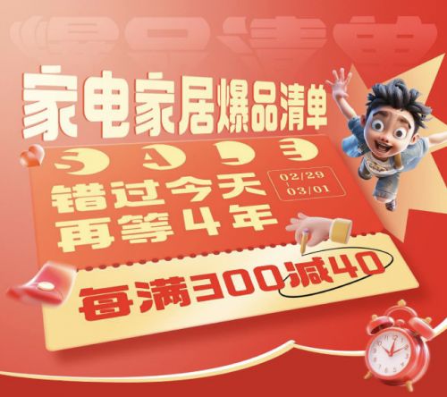春季焕新家正当时,2月29日,京东家电家居携手格力、美的、添可、海尔、林氏家居、野兽派、全友家居等大牌,带来日用家纺、品质厨具、家具建材以及大小家电海量新品爆品,消费者来京东购买家电家居产品不仅可享满300减40福利,爆款大电、大件产品还可享以旧换新立减10%优惠,省心更省钱。还等什么,错过今天可要再等4年。