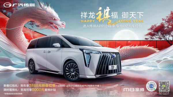 即日起至3月31日,下订传祺M8宗师,可享3888元新春红包!传祺品牌、BBA品牌车主置换可享8000元补贴,其他车主置换可享5000元补贴。