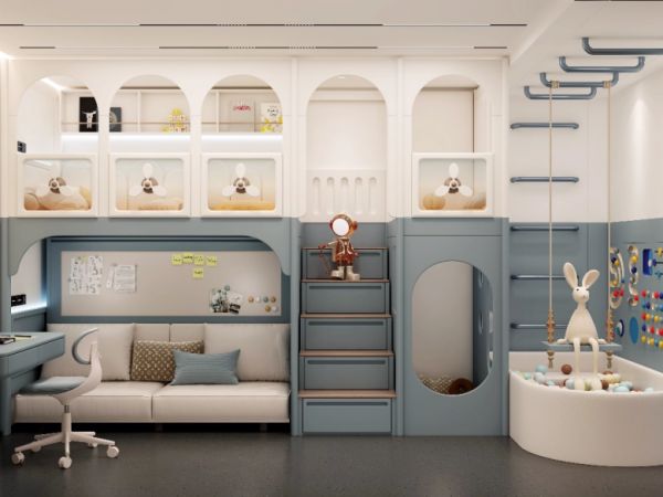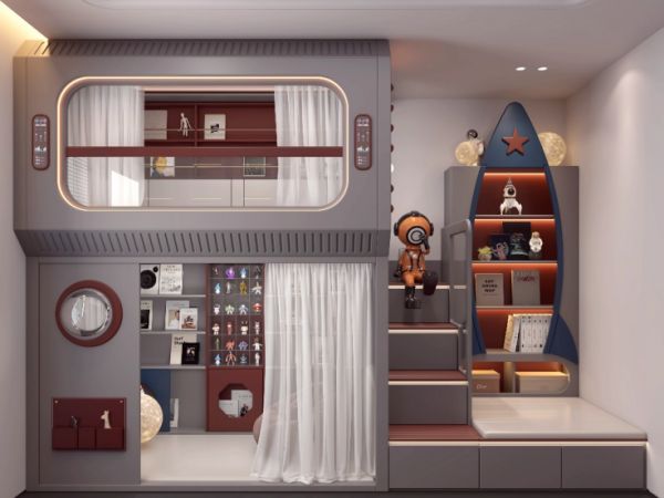 以宝贝对未知探索,我们以智能科技与太空为灵感,设计了一个太空舱式睡眠区。下方藏着娱乐与社交的秘密基地,充分重视孩子社交需求。场景右边是可变的飞船收纳柜或科技静音仓空间。整个套房以星球灰为主色,点缀星际蓝与铁锈红,让宝贝们尽情在智能空间中想象与探索。