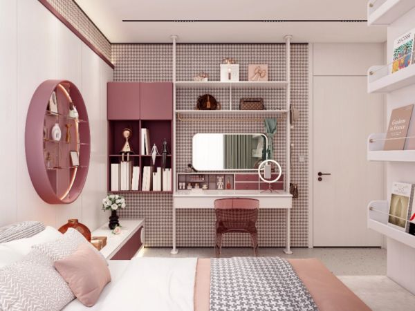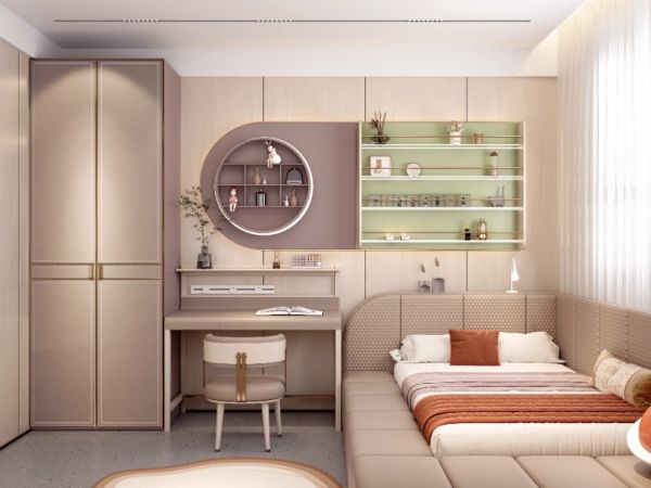 本案设计以清新水染白为主,辅以淡雅木纹与胭脂红点缀,墙面护墙板巧妙地运用了千鸟格纹,时尚不失雅致。睡眠区去除床头设计,搭配千鸟格布艺小靠枕,营造出温馨舒适的休息空间。床箱前抽屉收纳设计独特,步入式衣柜灵活多变,搭配消杀灯确保衣物健康。学习区或化妆区随需定制,圆形装饰壁挂融入中式元素,让空间更显深邃与雅致。每一处细节都经过精心打磨,旨在打造出一个既简约又不失设计感的美学空间。