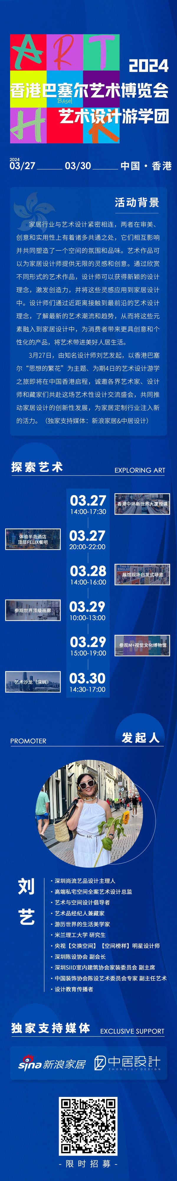 预告“思想的繁花”香港巴塞尔艺术博览会艺术设计游学团 3月27日即将启程,与知名设计师刘艺共赴这场艺术设计游学之旅。新浪家居X中居设计 独家媒体支持!