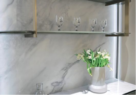 欧若拉精工奢石以精奢探索材料与空间的应用新模式,借助艺术手法展现空间与自然的和谐对话。质感十足入墙式透光酒柜锚定了视觉的焦点,白松露奢石纹理远观自然写意、近看肌理似光线穿透墙面晒落的斑驳疏影,创造出一方独特且更富有想象力的天地。