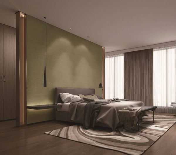 威泽装饰这款墙布作为采用橄榄绿的经典产品,将潮流英伦风恣意释放,略带颗粒质感的纹理铺陈于整个酒店墙面。与同样低调的棕灰色床品和窗帘搭配,彰显出一种高贵而又沉稳的风格,充满了浓郁的艺术气息。这种英伦气质的装饰风格在周边的黑色哑光吊灯、氛围灯和印象派风格地毯的映衬下,展现出别具一格的个性优雅。