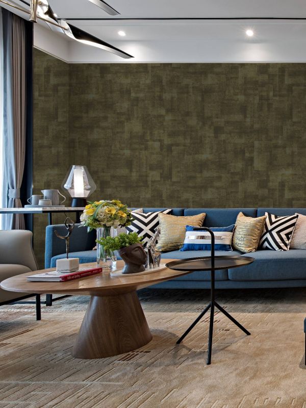 威泽装饰另一款橄榄绿墙布则主打复古风格,通过深浅不一的橄榄绿矩形纹理,与蓝色沙发的经典色彩搭配,加上浅木色的木桌、地板以及桌上自然花草的烘托,营造出复古文艺、自然舒适的氛围。这种场景搭配有助于给用户带来抚慰人心的感受,所以它备受在各种压力下工作的商务人群青睐。