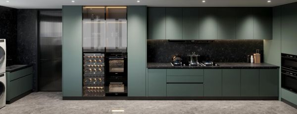嵌入式厨房墨绿色橱柜,与黑色背景形成微妙对比,L型的动线布局,带来了纯粹、沉静的视觉呈现,皮纹石英门板配合银白纹理进行延伸,既填补了视觉色彩层次,为这份冷静增添了奢华质感。