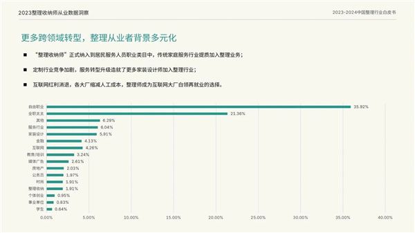 随着美好生活水平的不断提高,我们见证了整理收纳行业的一系列变化,尤其是在经济收益和服务多样性上的显著增长。越来越多的人通过整理收纳服务赚到了钱,众多跨领域转型从业者也纷纷向整理收纳行业涌入。