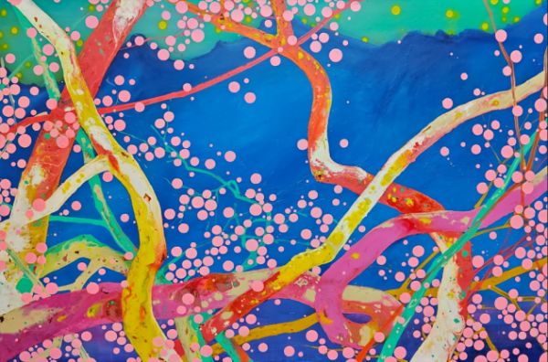这次跟萨米特合作的岩板艺术画,刚好是我了解到萨米特是以蓝色作为官方色的,我就采取蓝色作为背景进行了一个创作,树枝的那些颜色碰撞,还有那些圆点,可能对我来说是代表一种爱、一种空气,或者说是一种细胞,也有可能是一种音乐,它能够在整个画面形成一个生动的对比,有一个静态与动态的视觉冲击。很多观众看了我的作品,会感觉那些枝条像人类的血管一样,像细胞一样会流动,很有生命的张力。