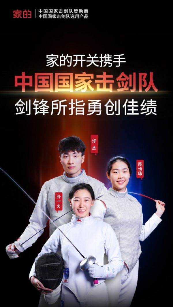 2024年4月,中山市家的电器有限公司(简称家的),成为中国国家击剑队赞助商!同时,家的产品也是中国国家击剑队选用产品。