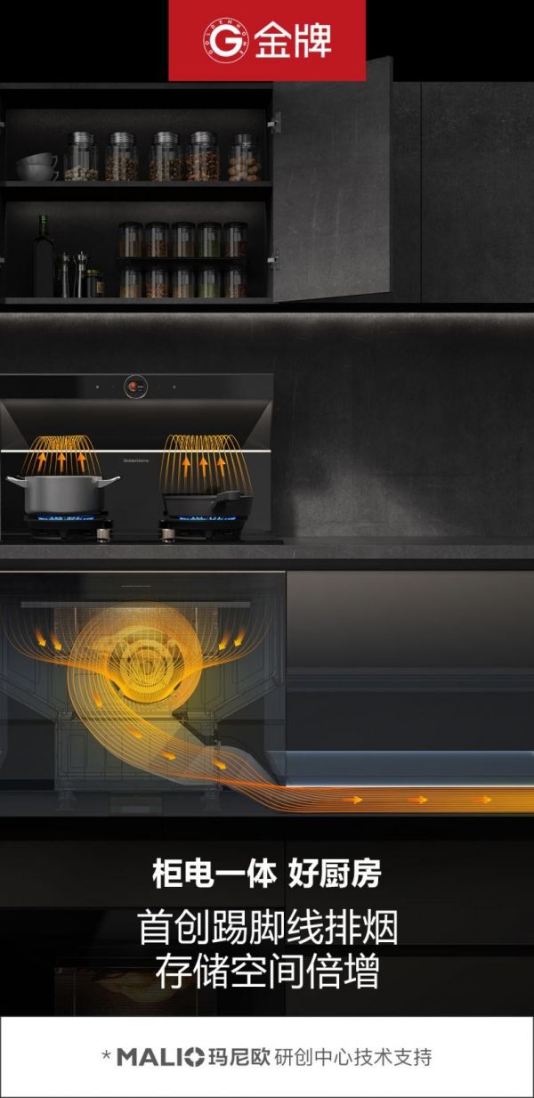 金牌柜电一体好厨房,完美嵌入GoldenHome柜电一体机,首创踢脚线排烟,摆脱以集成烹饪中心为代表的上排式排烟方案,及以集成灶为代表的地柜钻孔排烟方案,柜电一体好厨房,烟管不占吊柜,不占地柜;增加210L吊柜空间、164L地柜空间。