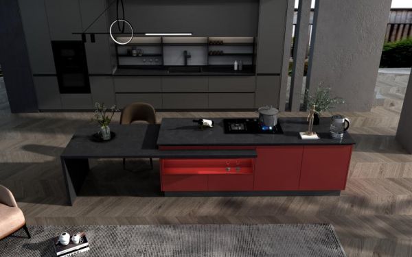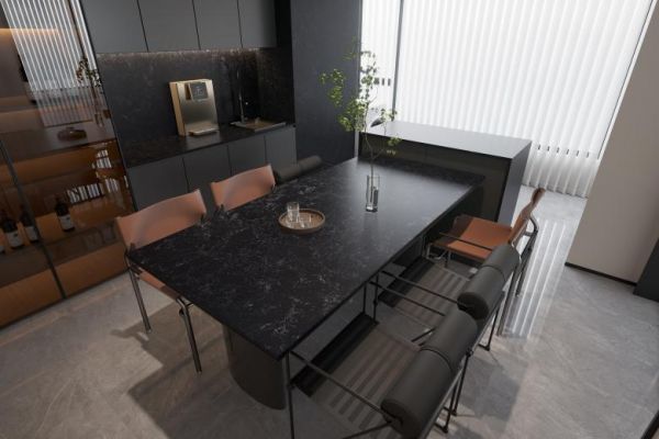 黑色系的厨房轻松匹配任何风格,开放式的设计格局不仅营造了空间的通透感,同时也让厨房成为家庭生活中的一部分,黑色极简风和法萨皮纹产品的设计相得益彰,不仅为家庭带来了视觉享受,同时也为烹饪和家庭时光提供了更好的环境。