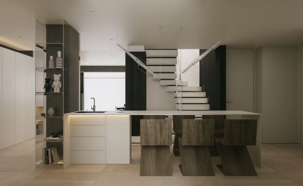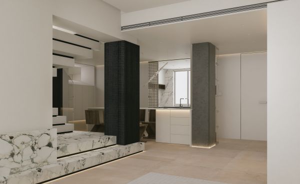 楼梯踏步为了更加纯粹,用了纯色岩板,黑色的大理石背景能衬托强调楼梯的雕塑感。