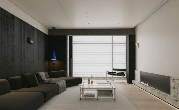 客厅以白色调和深色调相互碰撞。挑高设计,让视觉效果达到更加宽敞通透的感觉。同时布置了超大沙发和幕布观影,让业主三代6口纵享亲子时光。壁炉装饰创造出更多温暖记忆。