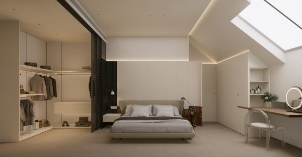 卧室整体是干净的奶油白色调,采用无主灯的方案,让错落的顶部更有设计感,并且顺应墙顶打造储物空间,好看更实用。