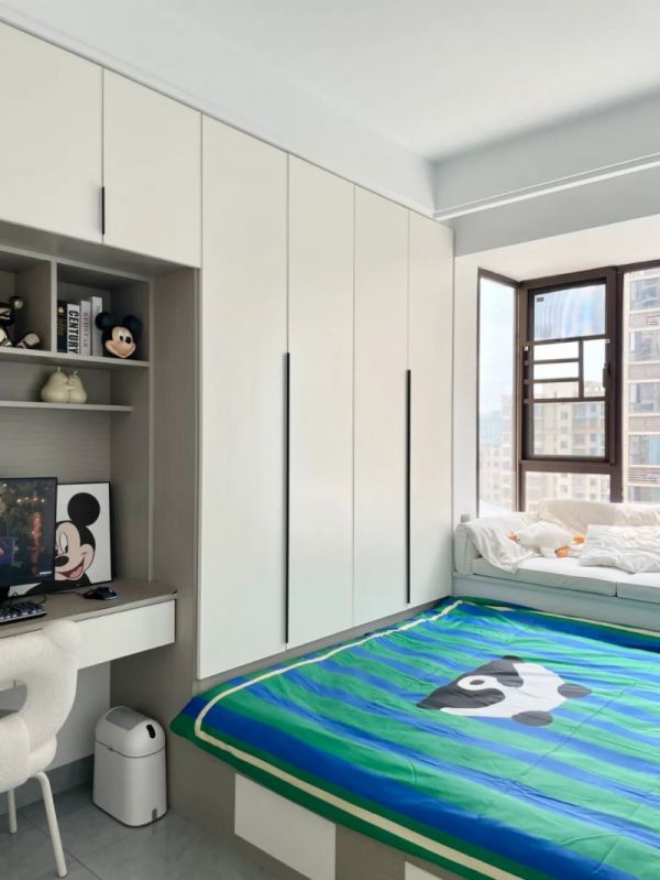 儿童房更是博主最用心的地方,小朋友的成长速度非常快,不仅板材需要选用高环保的,设计也要合理,符合孩子生活和学习的生活习惯。一门到顶衣柜和书桌一体设计,收纳和学习空间两不误,可以收纳各种玩具小摆件,拿取也很方便。