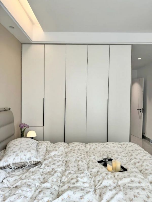卧室跟儿童房设计差不多,博主还是选用了一门到顶大衣柜,简单造型的平板门,用的极窄长把手,一年四季的衣服都可以放下,耐看又简约实用。