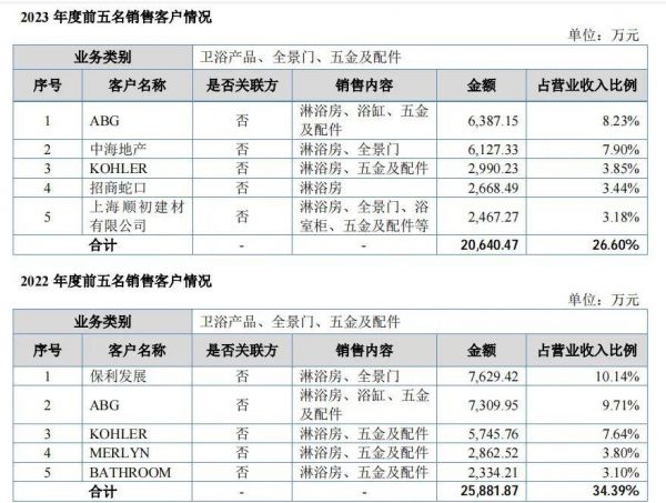 在产品或服务的主要消费群体方面,玫瑰岛的产品主要面向有装修需求的终端消费者、房地产企业、装修公司、酒店、国际卫浴企业等,其中前五名销售客户占比较大。例如2023年度前五名销售客户合计销售额为20,640.47万元,占比26.60%;2022年度前五名销售客户合计销售额为25,881.87万元,占比34.39%。不过,2023年和2022年前五名客户的变化较大。