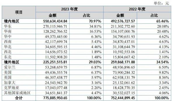境内区域,玫瑰岛公司产品的销售区域集中在华东、华南区域,2023年和2022年来自上述地区的收入合计占营业收入的比重分别为51.34%和48.56%。出口方面,玫瑰岛2023年和2022年的出口业务收入分别为22,525.15万元和25,986.82万元,占营业收入的比重分别为29.03%和34.54%。玫瑰岛表示2023年,公司出口业务收入同比下降13.32%,主要是受地缘政治和欧美市场需求变动的影响,美国客户的销售收入同比下降了33.10%;英国客户的销售收入同比下降了26.42%。