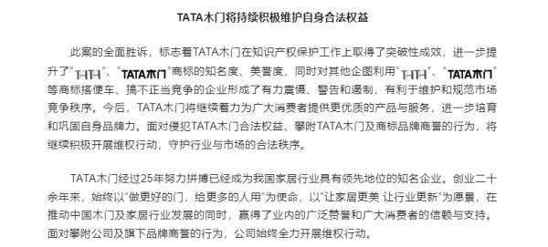 门窗快讯|TATA木门商标维权胜诉,还收获了意外之喜