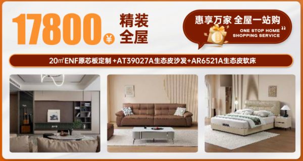 如果不想一样样挑家具,太子家具还配有精装全屋套餐,17800元精装套餐包含20㎡ENF原芯板定制+AT39027A生态皮沙发+AR6521A生态皮软床;29800元精装套餐包含20㎡抗菌净芯+随心配全国统一价23000元家具+乳胶优眠床垫*2,您可根据自己的需求来选择。