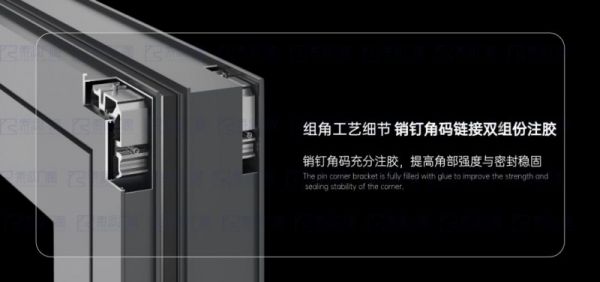 素派门窗采用销钉角码注胶连接,角码与型材缝隙间,注入德国WEISS韦思(原卫仕)双组份组角胶,型材端面滚刷防水胶,大幅提升提升角部结构强度,全方位严丝合缝,拼接密合不渗水,提高门窗防水性能。