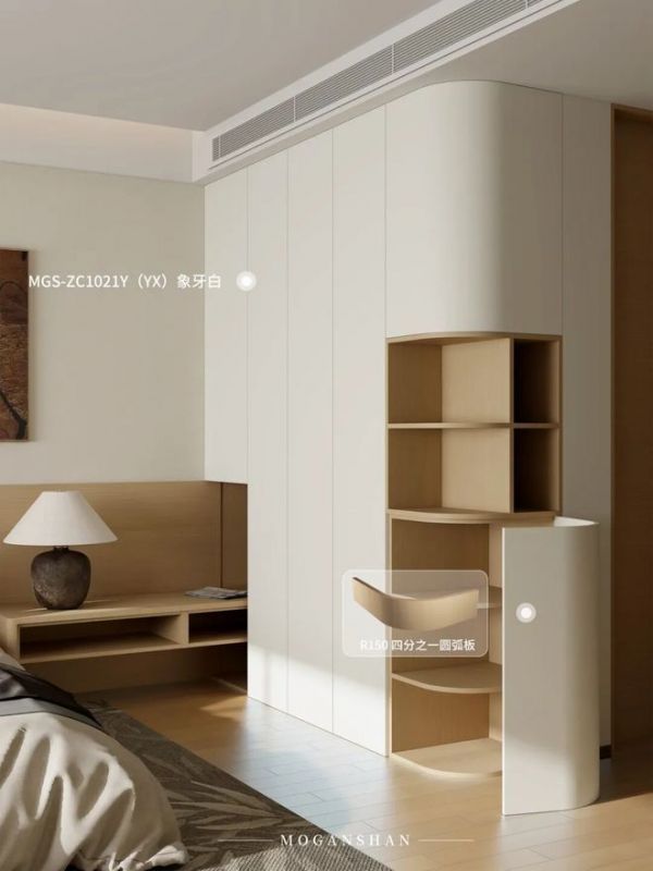 莫干山1/4圆弧板包含R30、R50、R100、R250等多种弧度规格,通常用在柜体、墙面的转角以及圆弧柜门的制作。1/4圆弧板将生硬的90°直角转化为流畅的曲线,使柜体和空间看起来更温和、精致。