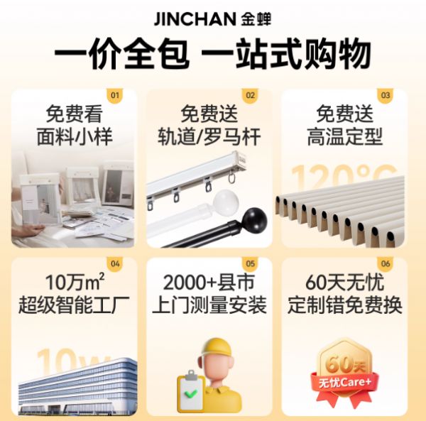 自1988年成立以来,金蝉窗帘已深耕窗帘行业37年,拥有106000平方米智能生产基地,凭借对消费者需求的深刻洞察和持之以恒的品质坚守,将定制窗帘的“选择难题”转化为“省心体验”。金蝉将品质把控贯穿生产全流程,以A类母婴级环保标准为核心,严选全球优质原料,甲醛零超标、无有害涂层,从源头上守护家居健康。