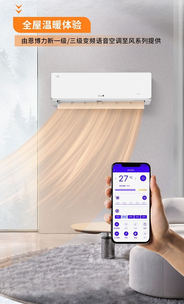 傍晚归途,寒风依旧,但家的温暖已悄然候场。恩博力新一级变频语音空调至风系列支持手机APP远程操控,归家途中轻触预约,到家即可享受适宜温度。60秒快速制热配合五档风速调节,迅速驱散室内寒意。智能语音控制解放双手,一键开启“舒适风”模式,自动优化送风角度,避免直吹不适,让温暖均匀漫润每一寸空间。