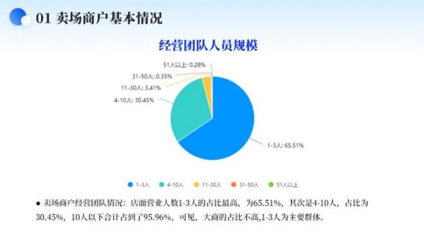 卖场商户经营团队情况:店面营业人数1-3人的占比最高,为65.51%,其次是4-10人,占比为30.45%,10人以下合计占到了95.96%,可见,大商的占比不高,1-3人为主要群体。