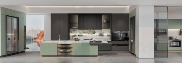 例如,在“洞庭”系列的厨房空间,实现了空间极简与功能极繁的平衡。在湖光盛境中,热气腾腾的烟火里,厨房油烟机嵌入顶柜、冰箱融于墙面,搭配创新石墨烯双面保温抽和透明升降屏,既确保了视觉语言的统一、功能逻辑的高效,又能令操作体验无感且流畅。