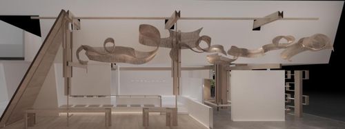 内部展陈 入口的编织隧道,引导观众完成从外界喧嚣到内部宁静的情绪过渡,顶部斜墙延伸至内部,空间由窄至宽,光线由暗渐明。同时,在产品展示上也打破了传统的线性陈列,以“穿梭之径”的概念营造探索感。