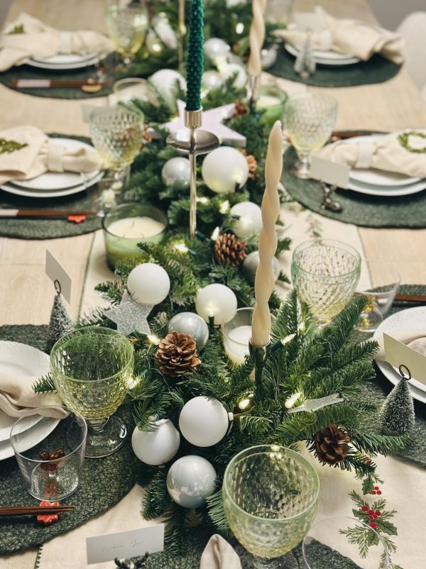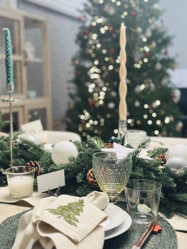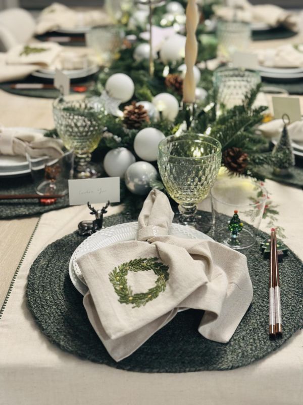 细节在此刻被无限放大:雪松与麋鹿造型的名卡架,让每位客人都成为这场仪式中独一1无二的角色;亚麻餐巾被精心折叠,上面绣有圣诞花环,搭配着白色的陶瓷餐巾扣;时下流行的ICHWNDORF节日玻璃杯,姜饼和松树都是应季的点缀,还有唯宝的复古酒杯,也是美轮美奂,而且,这些餐具都能进洗碗机,这也是快节奏生活的必备要求;餐桌中央,银色烛台高低错落,与青松、松果构成自然主义的中心装饰。而这一切的“氛围灵魂”,无疑是客厅那棵三米高、刚从山上砍回来的诺贝尔松树。它蓬勃的生命力与清冽的松香,充盈着整个空间,将山野的自然气息直接引入室内。