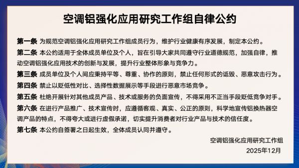 2025年 12月 11日,工作组成员单位正式发布《空调铝强化应用研究工作组自律公约》,明确禁止贬低性对比、选择性数据展示、虚假宣传等不正当竞争行为,要求所有 “铝代铜” 产品必须通过严苛实证测试和可靠性验证,确保质量不下降、性能不打折。