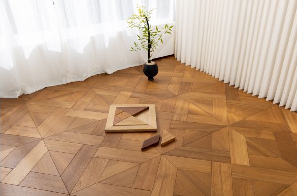 基于以上,天格在产品研发上,就依托于中国传统文化,从诗词音乐、名画建筑或自然风光等富含美的地方采集灵感,并赋予产品更丰富的文化内涵。比如近期天格发布的2026潮流新品,就以美学为根本,捕捉生活中光影与实木地板互动时各种美妙的瞬间,然后用设计去进行还原,带来了诸如“踏歌”“卿云”“星汉”等极具美学价值的产品,让用户拥有更丰富、更细腻的美学享受和情绪共鸣。而作为地板行业首创的全锁扣方形拼花实木地板,“大观”和“未央”这两款新品,则被赋予了更多的人文内涵,即有中国传统文化的内核又具备国际前沿的设计表现,经典与时尚并蓄。在刚刚结束的广州设计周,天格则以“编织”这一非遗文化为灵感,无论是展馆的设计搭建、还是联名产品的推出,都是中国传统文化的现代表达,也充分展现出“中国的即世界的”文化自信。