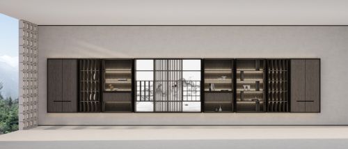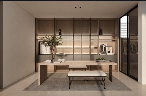 与之相邻的书房空间中,慕士塔格谷雨系统以浅木色定制收纳墙占据视觉中心,规整收纳书籍与艺术摆件。书柜以严谨的柱式序列排列,恰到好处的静,营造了空远意境。金属与板材用巧妙的工艺结合,局部点缀波浪板和特色造型,满足高端个性化需求。金属层板尾部艺术造型,巧妙隐藏灯光,达到了“见光不见灯”的效果,光线柔和地漫射开来,极大地增强了空间的层次感与仪式感。弧度优雅的花瓣造型立柱,与从大自然纹样提取转化形似麦穗成熟后垂头的几何背板,共同孕育着美好幸福的期盼,诉说着源自大地的情绪共鸣。