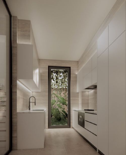 中厨区域取自FotileStyle洞庭系统,“仙居之处,洞府之庭”的万千气象被凝聚成一方佳色。油烟机升入了顶柜、冰箱融进了家具,当家居空间里的大家伙们,全都隐藏了起来,空间更整体、更简约,如山峦藏于雾霭,更显开阔与纯净之美。