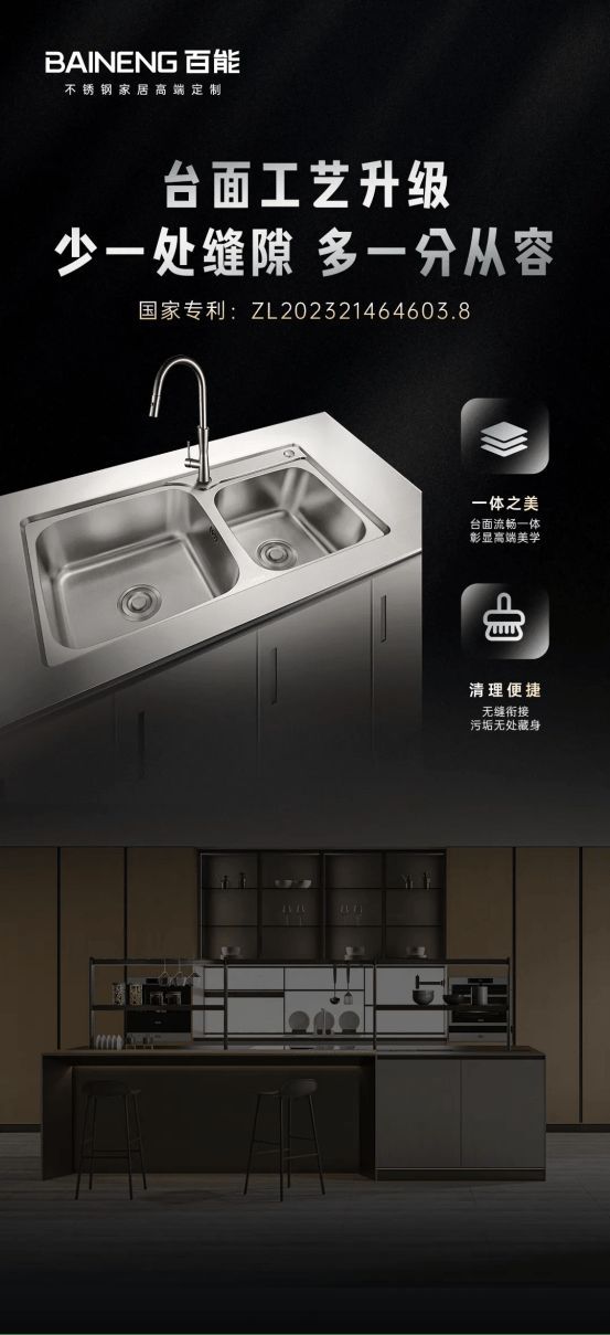 百能对台面工艺进行了革命性升级,实现了水槽、台面、后挡水条的一体无缝焊接成型。彻底消除了拼接缝隙,从根源上杜绝了污垢藏匿,让清洁打理变得异常轻松。流畅一体的外观,不仅彰显了高端简约的美学,更体现了百能对于细节与实用性的极致追求。