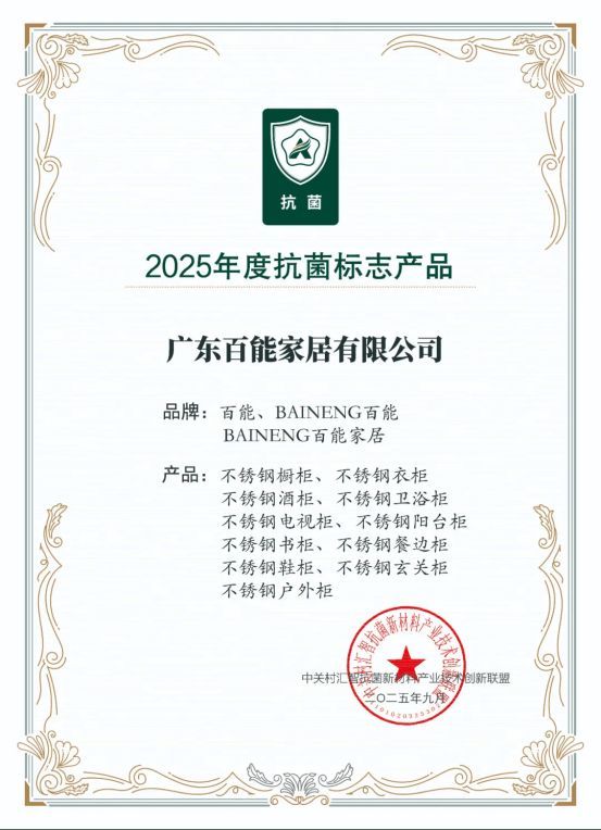 百能的技术突破,赢得了行业与权威机构的高度认可。CIAA抗菌协会授予百能家居“抗菌不锈钢家居领军品牌”称号,这一荣誉是对百能抗菌历程的高度认可。作为行业抗菌技术的开拓者,百能不仅是不锈钢家居行业首家获CIAA 抗菌认证及抗菌标志产品的企业,此前亦获得广东省橱柜商会与 CIAA 联合颁发的“家用柜类行业抗菌先行者”荣誉证书,持续引领行业健康发展。