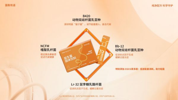 代谢活力配方(小橙条)创新性地将益生菌与茶多酚相结合,着眼于支持健康的能量代谢过程,适合关注体重管理和代谢健康的消费者。