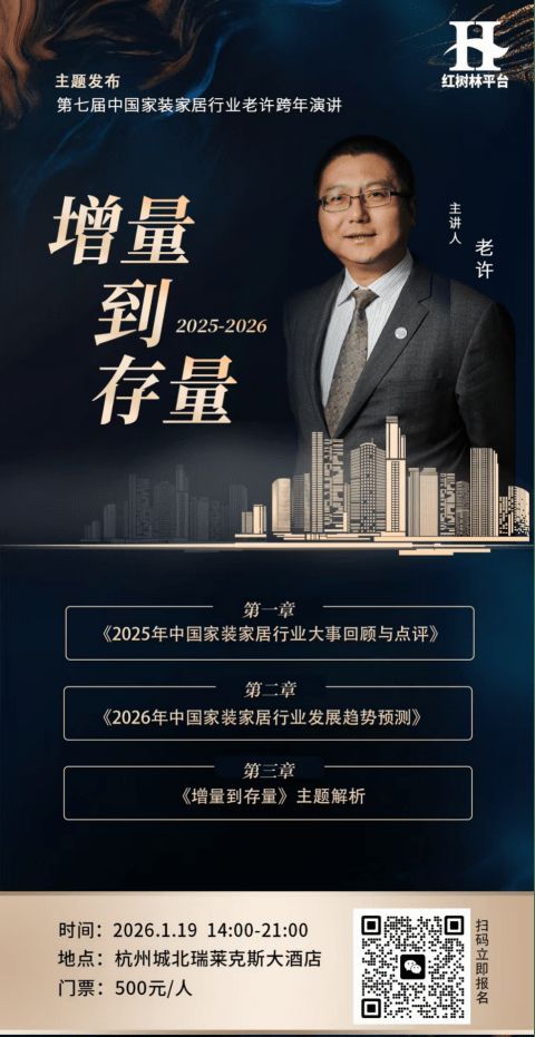 中国泛家居行业唯一的跨年演讲,第七届即将在杭州城北瑞莱克斯大酒店开幕。和往届一样,每次都会有往年行业大事件回顾与分析,新一年行业发展趋势预测。另外,这次演讲主题是《增量到存量》,将聚焦旧改话题。