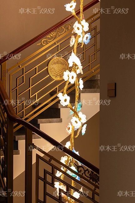 卓木王作为中式高定领军品牌,其打造的楼梯亦如艺术品。红木整装楼梯的温润亲和与金属的冷峻质感巧妙融合。楼梯扶手,凹凸文武线增强视觉层次,精铸的金属云纹将军柱、触感醇厚的红木寻丈扶手、精致的铜雕缠枝莲纹卡子花,辅以方胜纹棂格与磅礴的海水江崖纹饰,在古典雅韵中注入现代时尚气质。全铜鎏金琉璃艺术吊灯,鹦鹉花卉造型灵动璀璨,倾泻一室华光。拾级而上,尊崇尽显。