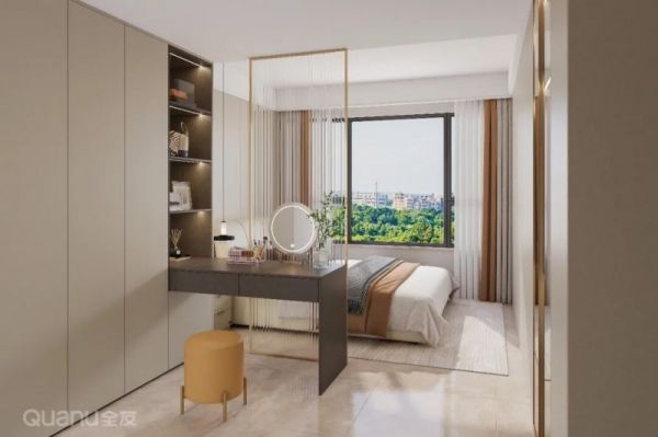 若想在卧室划分出独立衣帽间,可从衣柜自然延伸出梳妆台作为轻隔断,既划分功能区域,又保持空间通透感。