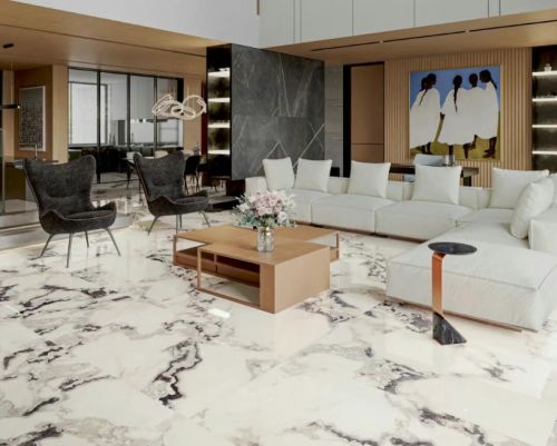 公司产品覆盖抛光砖、抛釉砖、岩板等全品类,旗下“马可波罗e-stone+”“马可波罗大板”等系列以高硬度、超低吸水率和卓越耐磨性广受好评。今年推出的臻石8135系列尤为突出:800×1350mm的黄金比例规格,既契合现代大宅的空间尺度,又能完整呈现连续纹理,减少切割损耗;超白岩板坯体确保色彩饱和、纹理清晰。通过高火慢烧与数码可控晶光抛工艺,砖面平整度提升15%,有效规避水波纹,呈现镜面级质感。硬核性能与高级审美兼备,使其成为高端抛光砖的标杆之选。